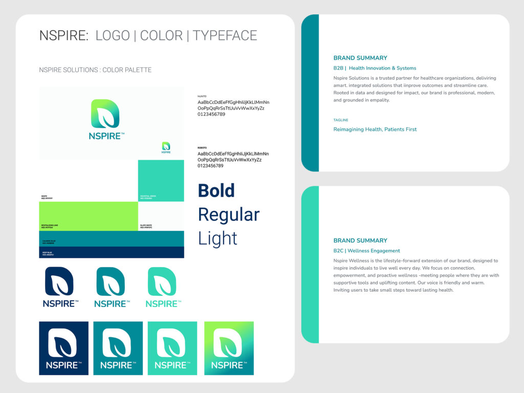 We delivered a full brand refresh, including updated logos, a refined color palette, a modern type system, and new photography guidelines. These elements were designed to reflect Nspire’s dual mission: delivering smart, data-driven healthcare solutions to providers (B2B), and building wellness-focused engagement with individuals (B2C).